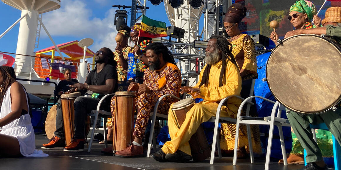 Each morning on the Jamrock Reggae Cruise, Nyabinghi drummers set up above the mainstage deck area to deliver a captivating Nyabinghi Sunrise Drumming Session.